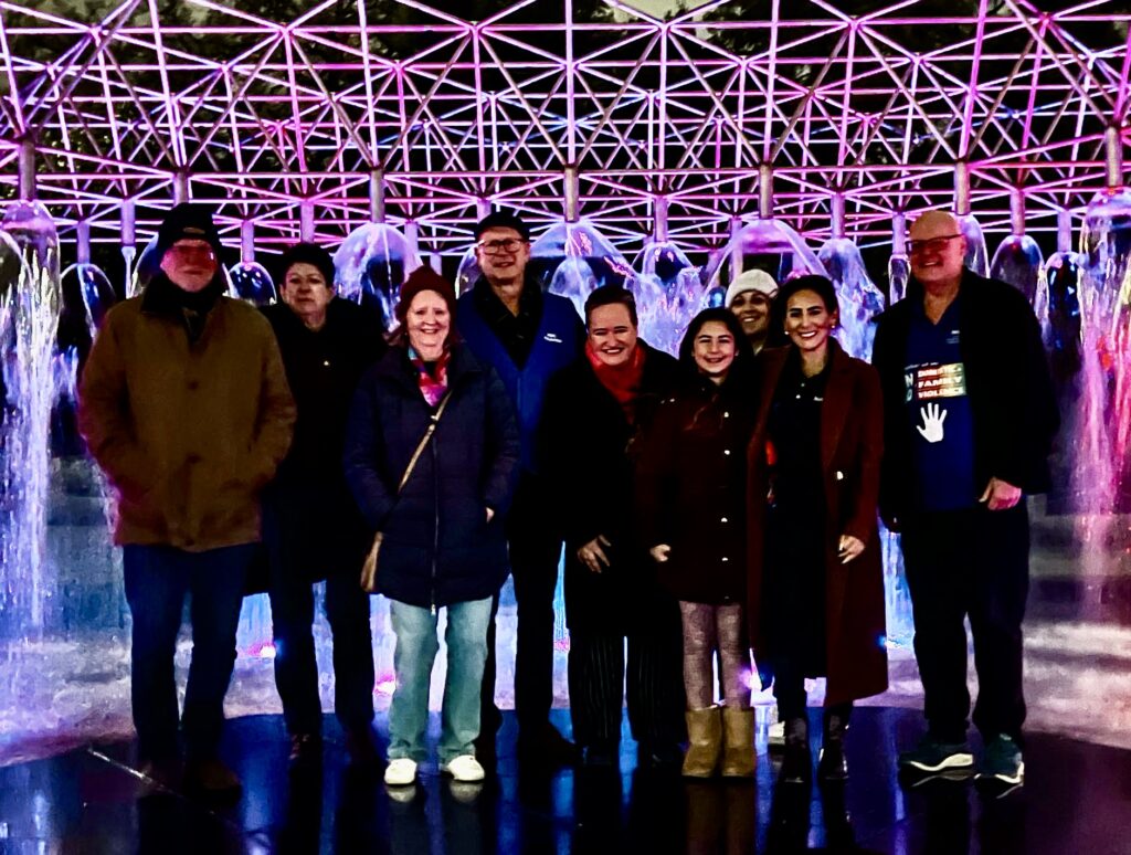 Members of the Pascoe Vale Rotary Club assembled at Coles Fountain in the Parliament Gardens, which was lit up in purple for WEAAD. There, they met Melbourne City Councillor Dr Olivia Ball for a chat and some photos.